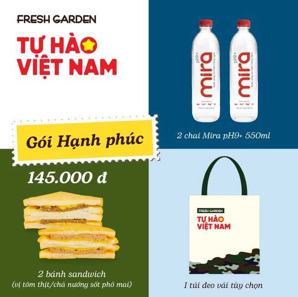 Gói Hạnh phúc - combo năng lượng với 2 vị sandwich mới toanh là sandwich tôm thịt sốt phô mai và sandwich chả nướng sốt phô mai, 2 chai Mira pH9+ mát lành và 1 túi đeo vải tuỳ chọn.