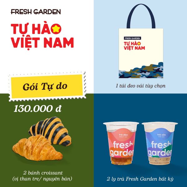 Gói Tự do - combo dành tặng những tâm hồn bay bổng, gồm: 2 bánh croissant vị nguyên bản/ than tre, kèm 2 ly trà Fresh Garden bất kỳ và 1 túi đeo vải tuỳ chọn.