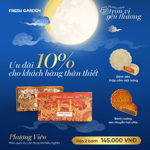 Trung thu là dịp để gắn kết tình thân, để mỗi hộp bánh trung thu Fresh Garden trở thành cầu nối yêu thương. Với bộ sưu tập 2025 cùng ưu đãi đặc biệt, Fresh Garden mong muốn mang đến cho bạn một mùa Tết trung thu thật trọn vẹn - vừa ngọt ngào trong hương vị, vừa ý nghĩa trong từng món quà. Đặt mua ngay hôm nay tại hệ thống hơn 70 cửa hàng hoặc fanpage của Fresh Garden để không bỏ lỡ ưu đãi bạn nhé!